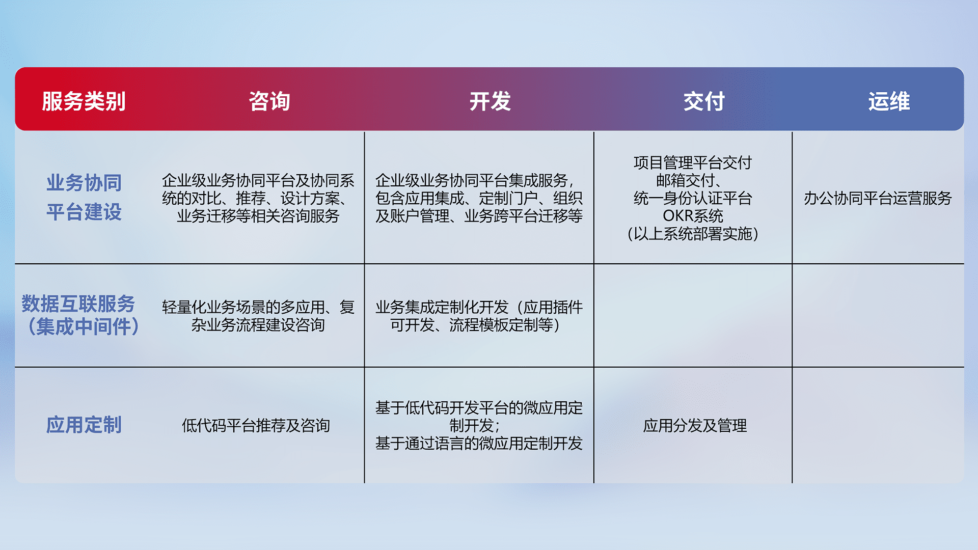 针对钉钉、、、企微、、IDaas等平台级产品提供产品的规划、、、、方案、、交付、、、、定制化开发等服务,,实现如统一协同办公、、、、智能客户服务、、、、混合会议管理、、、、智能数据查询、、、等业务场景,,,实现数字化转型。。