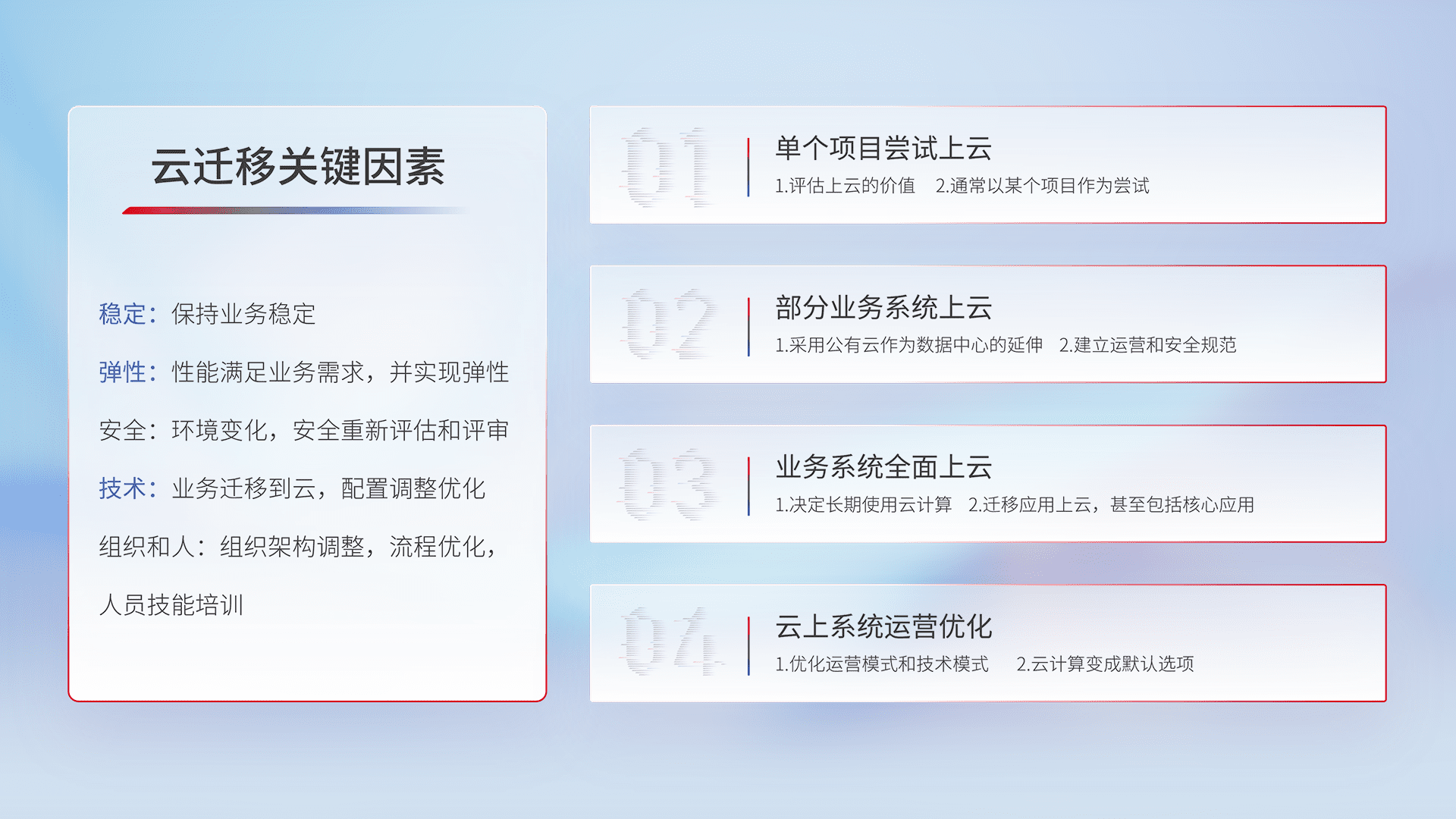 结合实际业务,,,从规划设计、、云平台选型、、云原生改造、、数据迁移、、集成交付,,迁移全过程为客户识别最佳上云路径,,,做好风险识别管理,,,,设计网络架构、、、身份权限、、安全审计合规、、、操作审计、、、日志审计、、、、监控告警策略、、、多站点容灾设计等,,,对云上基础设施进行整体规划,,提升IT治理水平,,以满足弹性、、、高可用、、高性能的需求。。。。