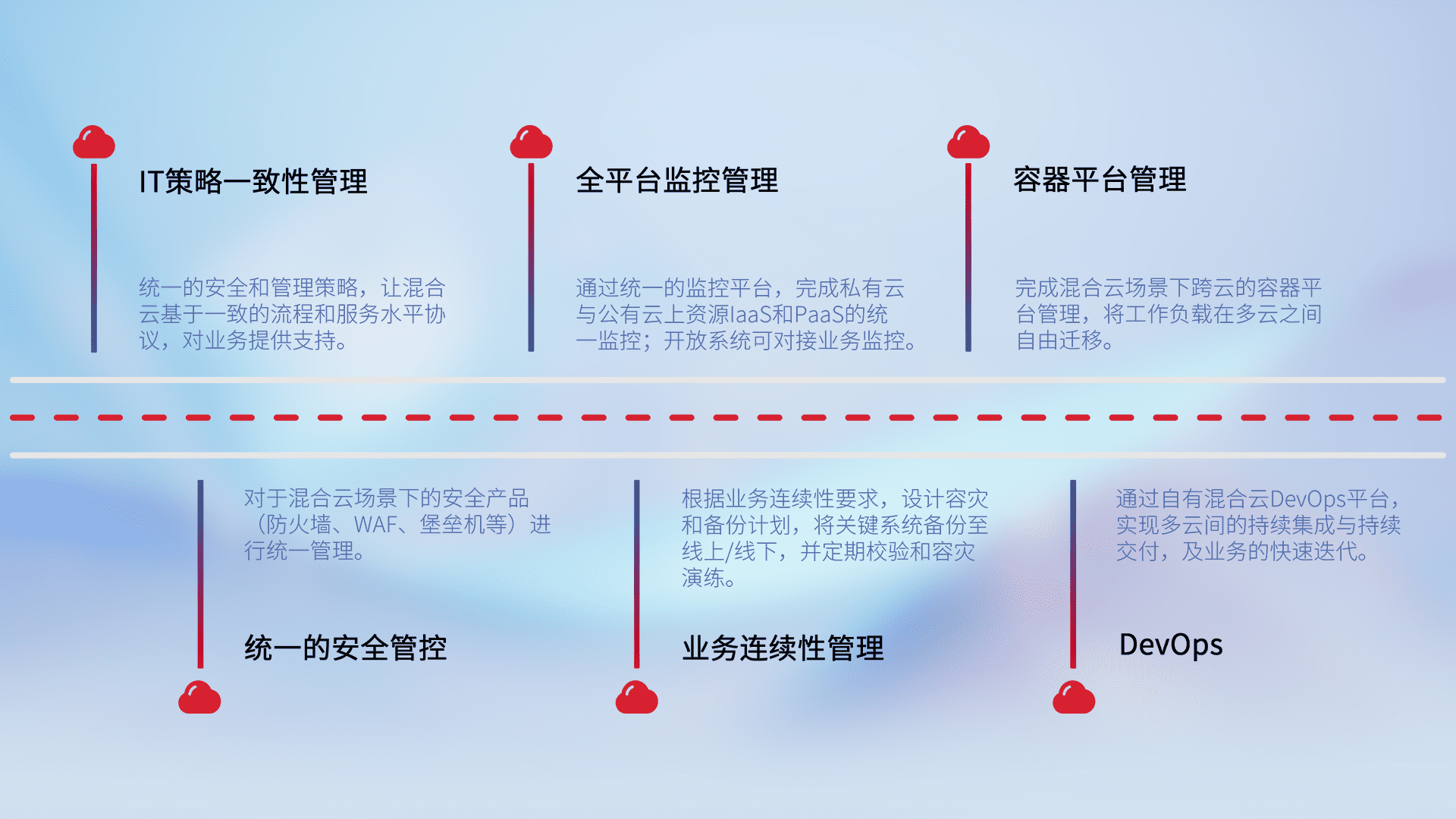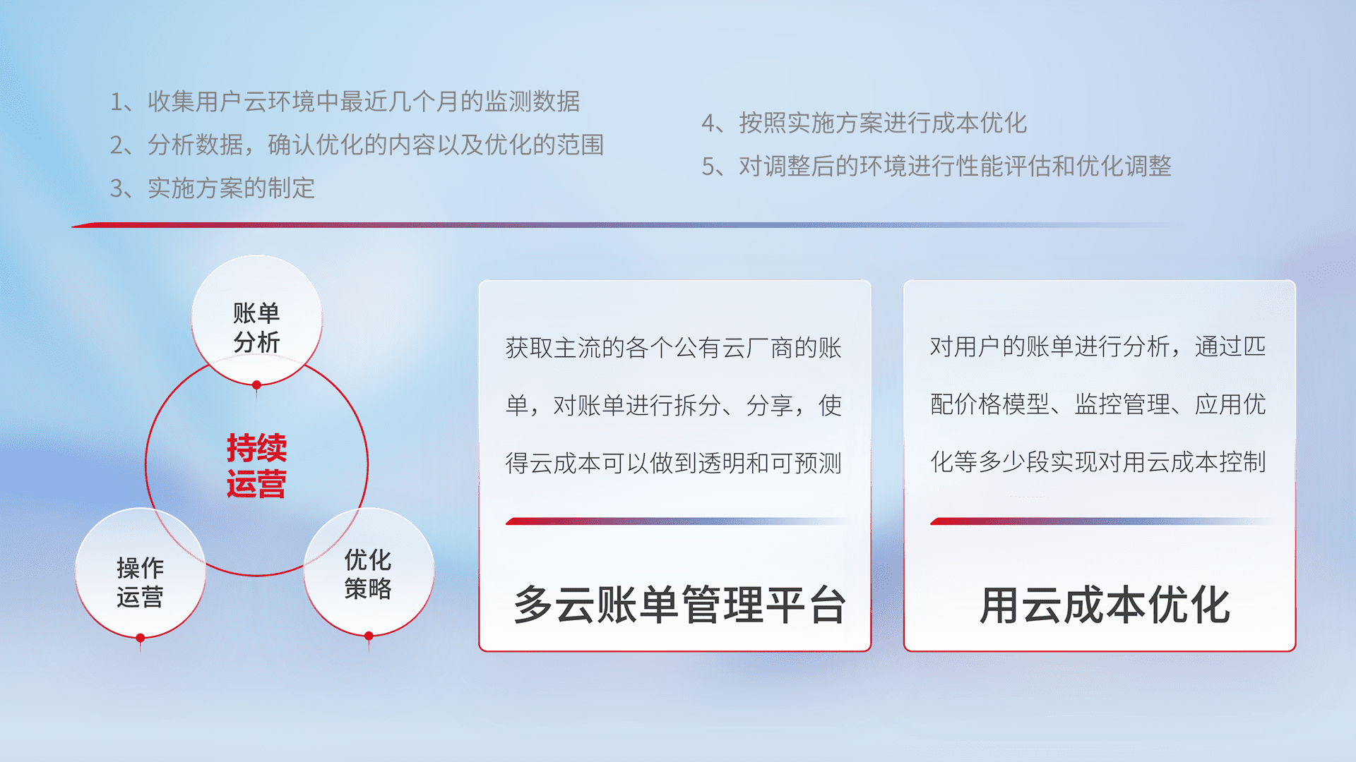 通过多云纳管,,,以统一的资源数据模型把客户的云资源进行抽象和封装,,,进而实现对多云资源的统一操作,,,保障云资源管理的可靠性、、、稳定性与可用性。。量身定制化运维内容,,,,配置、、、开发运维、、补丁管理、、备份、、、监控、、、认证和访问管理、、、审计和日常巡检等,,,保障在用云过程中的可靠度,,,,稳定度以及高可用率。。。