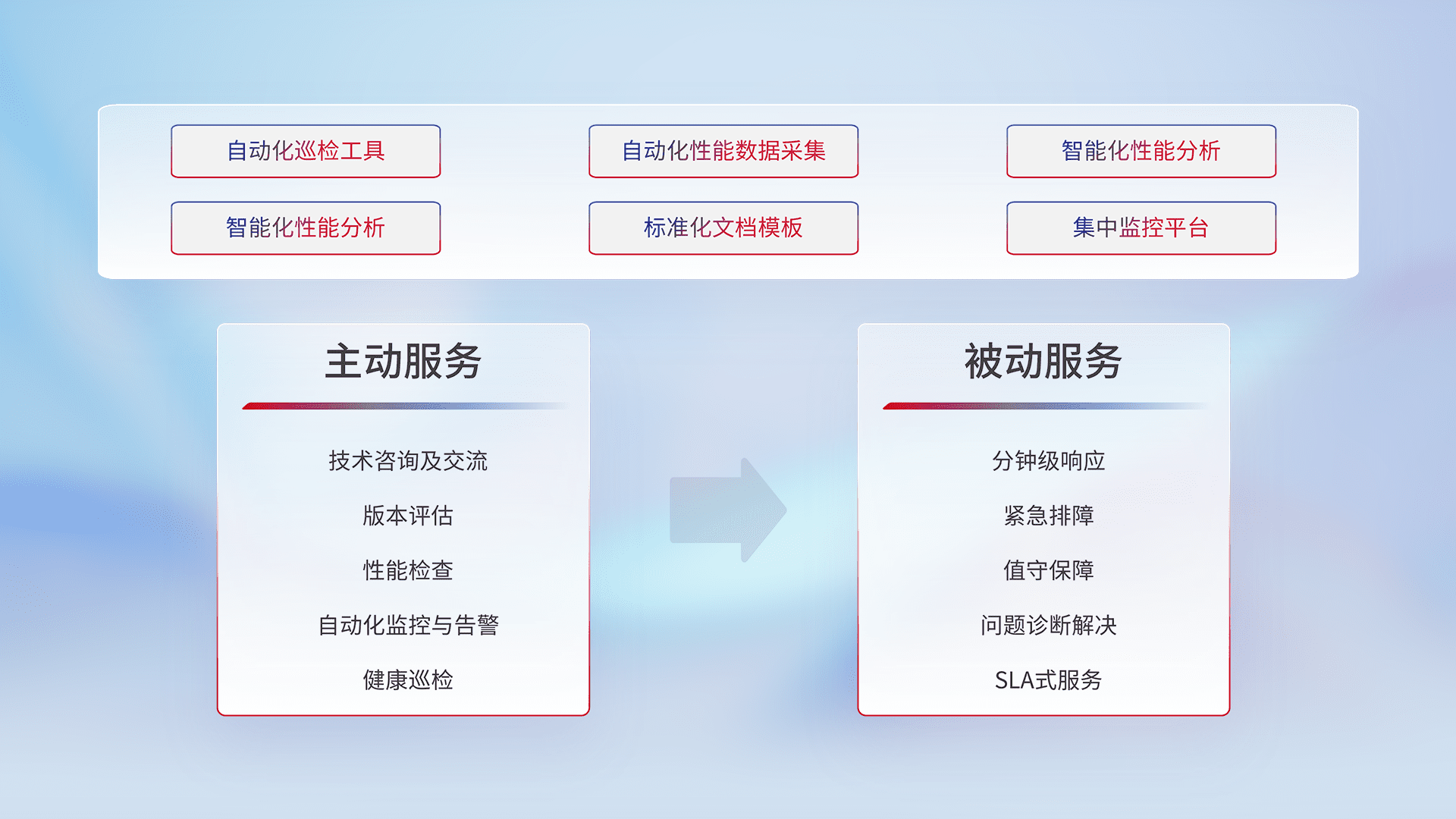 智能化工具和标准化文档,,,保障服务质量,,,,提供主动服务(包含技术咨询、、版本评估、、、性能检查、、自动化监控与告警、、、、健康巡检)和被动服务包含(分钟级响应、、、、紧急排障、、、、值守保障、、、、问题诊断解决、、SLA服务)。。。。