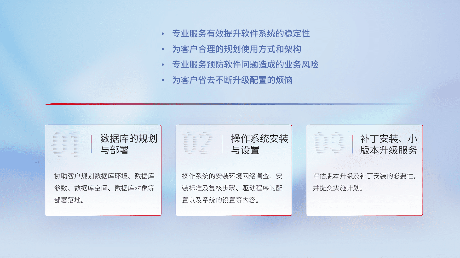 为客户提供软件规模升级、、快速部署、、按需配置的专业服务,,,从数据库的规划与部署到操作系统的安装与设置,,再到补丁安装和小版本升级提供支持。。